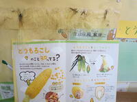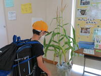 今日は、昇降口の給食コーナーに鉢植えのとうもろこしを置きました。本日の給食の献立の中に「とうもろこし」があるからです。登校してきた子どもたちは、そら豆のように空に向かってついている実を足を止めて珍しそうに見ていました。