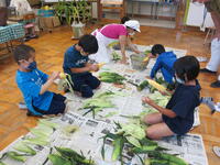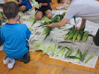 にじいろ学級のお友だちが、食育の一環として、とうもろこしの皮むきを行いました。手指を念入りに消毒して、広げた新聞紙の上での作業です。「①皮とひげをきれいにとること②皮の枚数を数えること」が目標でしたが、みんなとても上手に作業できました。1本のとうもろこしには、だいたい皮が10枚程度ついていること、ひげが粒一つから1本出ていることなどを体験を通して学ぶことができました。何よりも、皮むきをみんなが楽しんでいました。