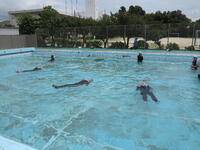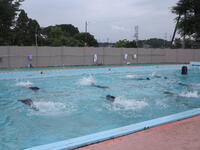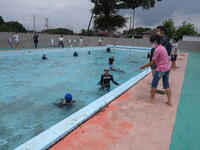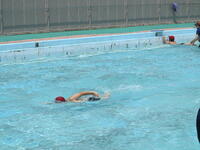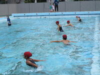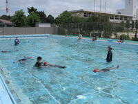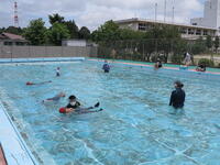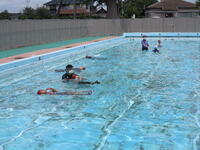 本日、3.4年生が着衣泳を実施しました。はじめは、普段通りに水着で水慣れをしてから始めました。水慣れが終わってから、持ってきた衣服と靴を身につけて着衣泳を始めました。水に溺れてしまったもしもの時、誰かが通報してくれたとしても、助けが到着するのは8分かかると言われています。とすると、自分の力でその8分間(もっとかかる場合もある)をどうにか乗り切らなければなりません。力を抜いて仰向けになって浮かぶこと、そして、身近にペットボトルなどの浮くものがあれば、それを利用して抱えて浮くことなどを体験しました。