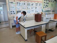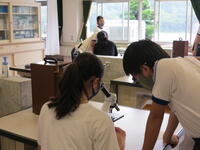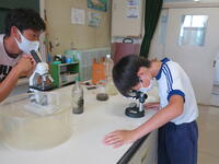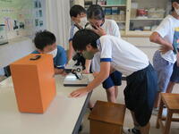 今日は、6年生の理科の学習を紹介します。理科室で学習していたのは、「水の中の生き物」についての学習です。コウノトリの里の近くで採取してきた水の中にいる生き物を調べる学習です。顕微鏡で拡大して観察しました。子どもたちは、対物レンズの中心にプレパラートにのせた対象物を持ってくる調整に苦心していました。