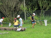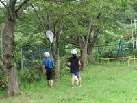 今日、1.2年.にじいろ学級が、11号公園に行き虫捕りをする予定でしたが延期をしました。朝早くの降雨で遊具が濡れていたため、子どもたちの安全確保に心配があると判断したためです。残念ながら、9月に延期となりました。2年生は、2時間目に校庭に出で、虫を探しました。歩くたびに小さなバッタが跳ねるので、網で捕まえました。まだ、翅が生えていない幼虫です。いろいろな種類のバッタやコオロギを見つけました。