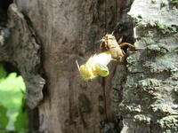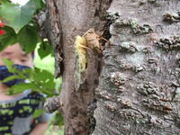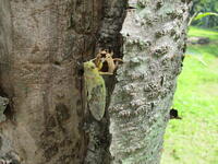 今朝、にじいろ学級のお友だちが、昨日に引き続き校庭の散策をしていると、ボールネット近くの桜の木にいた羽化しかけのニイニイゼミを見つけました。背中を割って出てきたのは、白くて黄緑色の透明な羽を持ったセミでした。背中をそらしてじっと動かないので、生きているのか心配になりました。その後、給食室の方へ足を延ばし、戻ってみると、もう、羽化が終わっていました。羽に体液を送って羽を伸ばし乾かしているところでした。みんな、びっくりしました。こんな体験ができるなんて・・・。いつも一生懸命学習したり遊んだりしているにじいろ学級のみなさんに、お日様が贈り物をしてくれたのでしょう。お日様がさんさんと注ぐ、暑い朝の出来事でした。