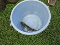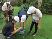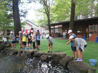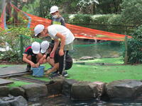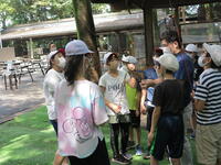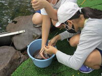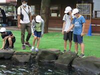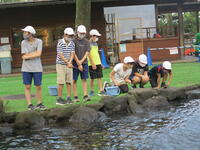 本日、6年生は校外学習の日でした。朝から天気に恵まれましたが、昨日の清水公園付近のゲリラ豪雨のため、予定していたアスレチックの開園時刻が12時に繰り下がってしまいました。そのため、急遽予定を変更してニジマス釣りを行うこととしました。清水公園内にある釣り場は、木々が茂っていて、適度な日陰があり快適な環境で釣りを楽しむことができました。一番乗りで到着したため、貸し切り状態で活動できました。