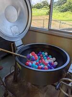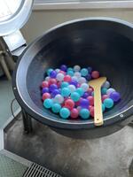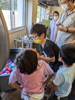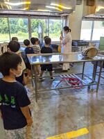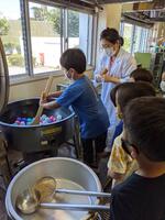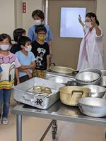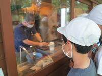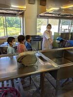 給食室に入るのは、はじめてです。子どもたちは、若松先生の説明を聞いたり、大きなお釜に入っている食材(ボール)を大きなしゃもじでかき混ぜる体験をしたりしました。この体験を通して、いつも食べている給食がどのように作られているのかがわかったようです。夏休み明けからは、以前より想像力を膨らませて給食を食べることができますね。貴重な体験ができました。協力してくださった調理員のみなさん、ありがとうございました。