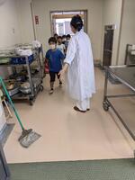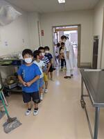 先日、19日は大掃除の日でした。給食も最終日を迎え午後からは最終の片付け、消毒をして長期の夏休みに入ります。大掃除に入る前に、1年生とにじいろ学級のお友だちが、給食室ツアーをしました。案内してくれたのは、栄養士の若松先生です。