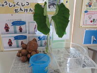 また、今日の給食の「さといもの味噌汁」の具材の里芋のレプリカを見たり、畑の先生の金剛寺さんが用意してくださった里芋の葉っぱに水をかけたりする活動も行いました。
