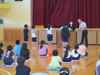 本日、下校前に、1.2年生の防犯安全教室を実施しました。市の担当の方と青パトロールで児童の登下校時に、見守りの巡回をしてくださっている方が来てくださり、話をしてくださいました。
