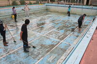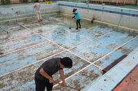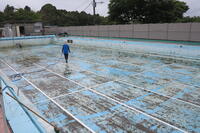 本日、プール掃除を行いました。プールの中には、大きなカエルが2匹とたくさんのヤゴ、オタマジャクシがいました。生き物を救出しながらの清掃です。6年生が、プールサイドの草を抜いたり、テントを設営したりしてくれました。時折、雨が落ちてくる時間もありましたが、1日かけて大部分の清掃が完了しました。今月末のプール開きが楽しみです。