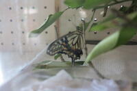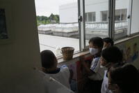6/6の月曜日の朝、子どもたちが登校すると3.4年生教室前で飼育していたナミアゲハのさなぎが羽化していました。月曜日から雨模様が続き、外に放すことができずにいた蝶を3階の窓より放蝶しました。気温も低く寒い朝でしたが、雨が落ちていない時間を見計らっての放蝶です。最初は、なかなか飛び立ちませんでしたが、しばらくすると空高く飛び立っていきました。羽化した蝶は、片方の尾状突起が取れてしまっていましたが、元気に飛び立ったので安心しました。昼間少し明るくなり温かくなってきたとき、校庭の花壇の近くを舞っているのを見かけました。無事、命が次の世代に繋がりますように・・・。