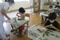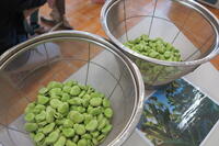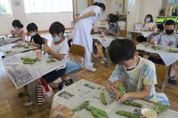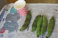 今日は、食育の一環として1年生のお友だちが、給食の食材のそら豆の皮むきをしてくれました。栄養士の若松先生から、衛生面の注意を聞いてから、皮むきにチャレンジしました。初めて皮むきをする子どもたちが多く、興味津々に取り組んでいました。皮が厚いこと、中にはふわふわなベットのようなものがあること、黒いおへそがあること等々、体験を通してたくさんのことを発見しました。体験の後は、気づいたことをカードに書き入れました。空を向いて実ができるので、「そら豆」という名前が付いたことも知ることができました。