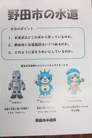 学習の終わりに、野田市のマスコットキャラクターの「ロボカン」、「すいっぴー」、「みずかちゃん」の絵付きの野田市の水道水のペットボトルを一人一本、同じくキャラクター付きの自由帳を一人一冊いただきました。2時間に及ぶ、授業をテンポよく分かりやすく展開してくださった水道局の皆さん、ありがとうございました。