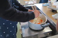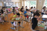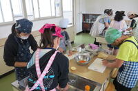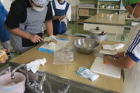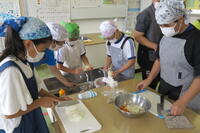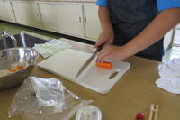 6月28日(水)の5時間目に、6年生が調理実習を実施しました。コロナ感染症流行防止に努めながらの実習です。昨年度はコロナ渦でしたので、調理実習を学校で実施することができませんでしたが、林間学校でのカレー作りで初めて包丁を握って野菜を切る経験をした子もいました。今年度は、学校の家庭科室で全員が包丁を使って野菜を切り、フライパンに油をひいて炒める経験ができました。卵を割って調理もしました。自分が作ったおかずを美味しそうに食べていました。