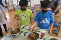 今日は、5年生の調理実習でした。林間学校で作るカレー作りを家庭科室で体験しました。実際に、家庭でカレーを作ったことがある児童、今日初めて包丁を使う児童など経験は様々でしたが、どの子も真剣に実習に取り組んでいました。今日は、豚肉の代わりにコンビーフを入れてカレーを作りました。玉ねぎやコンビーフの甘さが加わって、コクのあるカレーが出来上がりました。