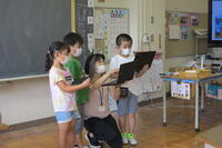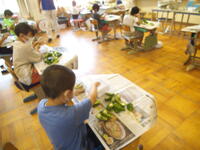 今日は、2年生が給食で使うとうもろこしの食材の皮むきをしてくれました。さすが2年生です。すぐにコツをつかんで、一人3本の皮むきをしてくれました。今日の給食のとうもろこしご飯は、とうもろこしの芯だけをお米の上に置いて炊いているので、ごはんに風味がついています。2年生はその後、学校図書館支援員の手塚先生に「やさい」が主人公の絵本の読み聞かせをしていただきました。食育と給食+読書指導を加え、効果的な指導をしています。