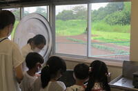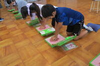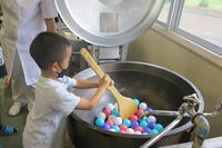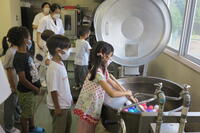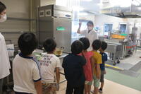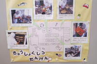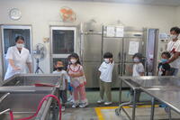 本日、1年生対象の「給食室探検ツアー」を行いました。目的は、「①給食室を直接見て、触れることで給食室を知る。②給食室の釜での作業の疑似体験により作り手のことを知る。」の2つです。子どもたちは栄養士の若松先生の案内で、給食室の大きな冷蔵庫、調理台、お釜、フライヤー、しゃもじなどを見たり触ったりしました。しゃもじの大きさや、かき混ぜる時の力の入れ具合など、疑似体験することで学びを深めました。おいしい給食がどうやって作られているのかを知る体験でした。また、いつもおいしい給食を作ってくださっている調理員さんたちが、後ろの方で子どもたちの体験ツアーを見守ってくださっていました。体験後は、見たり触ったりしたものを思い出しながら、シールを貼りました。福二小のみんなが、給食を残さず食べて元気な体と心を作ることが調理員さんたちの願いです。