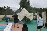 今日は、梅雨が再来したかのようなじめじめした一日でした。昨日で、今年度のプール学習が終了しました。今朝、雨が落ちる前に、6年生がプールじまいをしてくれました。テントを片づけ、使用したものの整理を行いました。6年生にとっては、6年間のプール学習の終了です。一つ一つ丁寧に後片付けをしてくれました。