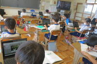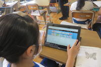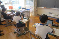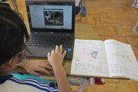 本校は、教育委員会より指定を受け、eライブラリの百科事典を導入し学習を進めています。今日は、教育委員会とeライブラリの提供元の方々が、実際の授業での活用の様子を見にいらっしゃいました。授業展開したのは、3年生です。理科の生き物の学習での活用です。先日、校庭で秋の生き物探しを行いました。どこにいたのか、どんな様子だったのか観察をしました。今日は「NHK for school」を視聴してから、学習を始めました。自分が調べしている生き物を見つけた「場所」に着目して、さらに調べる学習です。そこで、eライブラリの百科事典の機能を使って授業が進みました、子どもたちは、思い思いに百科辞典の機能を使って調べ学習を進めました。調べていくと子どもたちは、生き物の住みかはその生き物の食べ物と関係があることに気づいていきます。図書室にも学習に役立つ本を揃えています。ICTの機能と書籍を併用しながら学習を進めていきます。