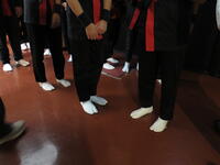 本日、3年ぶりに実施された野田ガスホールでの「市内音楽会」に、本校の太鼓部が出演しました。ここ数年、コロナ渦のため大きな舞台に立つことができなかったので、子どもたちにとっては、初めての大きな舞台でした。残念ながら、保護者の皆さんが会場に入ることはできませんでしたが、今までで最高のパフォーマンスを披露することができました。写真は、舞台に上がる前の緊張した面持ちの様子ですが、舞台を下りた後は達成感でいっぱいの表情でした。(ホール内での写真撮影は禁止されていたので残念ながら舞台上の写真はありません。)午前午後の入れ替えで2日間という日程での音楽会でした。リズムを崩すことなく細かなところまで合わせた素晴らしい演奏だったとお二人の講師の先生にも褒めていただきました。そして、三つの中学校の圧巻の演奏を鑑賞することができたのも、子どもたちにとって目標を持つ、よい機会となりました。