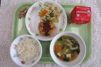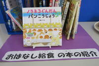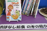 おはなし給食11日目は、「おばけのアッチとコロッケとうさん」の本に登場するコロッケが主役です。テレビ番組に出たおばけのアッチは、天才コックと言われ得意になっています。ところが、アッチはコロッケが上手に作れなくなってしまいました。売れ残ったコロッケを捨てようとしたその時、そのコロッケがしゃべり始めます。そのコロッケがコロッケとうさんでした。さて、アッチは昔のように上手にコロッケを作れる天才コックにもどれるのでしょうか?少し厚い本です。中学年向きの本です。児童昇降口に展示してある本を手に取ってみている.1年生もいました。今日、お昼の放送でこの本を紹介したのは、にじいろ学級の長田先生です。