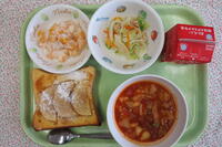 今日は、おはなし給食16日目でした。今日の主役は、「ルルとララのフレンチトースト」に登場するフレンチトーストです。青森のリンゴを使ってアップルフレンチトーストにしました。ルルとララシリーズノートパソコン本の料理は、去年もたくさん給食に登場しました。この本は、硬い食パンがおいしく変身するフレンチトーストの作り方をレクチャーしてくれています。ココアやいちごミルクあじなど、作ってみたくなるフレンチトーストがたくさん登場します。今日、お昼の放送で本を紹介してくれたのは、狼先生です。子どもたちには、自分の人生を健康に豊かにしてくれる料理に興味を持ってほしいので、読んでほしいシリーズ本です。