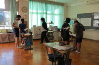 今日の授業のテーマは「炎色反応」についてです。5つの水溶液を染み込ませた綿が、燃える時にどのような色をしているかを調べる実験をしました。実験の結果、銅→緑、ナトリウム→オレンジ、カルシウム→オレンジ、ストロンチウム→赤、カリウム→紫・ピンクとなりました。少人数ですので、全員が自分の手ですべての実験を行うことができました。先生は、とても丁寧に説明してくださり、子どもたちは中学校での理科の学習が楽しみになりました。