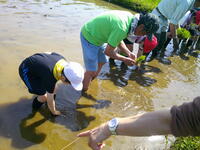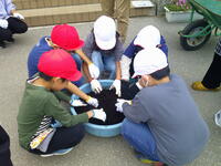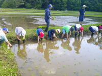 苗の植え方(根のところを持って3~5本くらいをほぐす・ひもについた目印のところへ植える・手で土をならした後しっかりと土に差し込む 等)を教わった後、水田に入り田植えを行いました。むこうずねの高さまで泥にずっぽりと入って頑張りました。あの深さの泥に足を入れたことが初めてだった児童もいたようです。少しずつ慣れてペースも上がり、予定した時間で無事に苗を植え終えることができました。