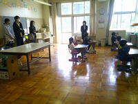 1・2年生が元気いっぱいに体育館で体育の学習を行っていました。家髙先生の指示に従って笛が鳴るたびに、逆向きに走ったり、スキップをしたり、四つん這いで走ったり、忍者になって走ったり、太陽になって!!走ったり…元気いっぱい、へとへとになうまで走った後は2チームに分かれてのボール運び競争をしました。こちらも、頭の上を通したり、またの下を通したり、体をひねって渡したりといろいろな動きを取り入れていました。