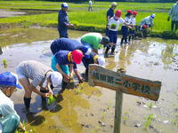 苗の植え方(根のところを持って3~5本くらいをほぐす・ひもについた目印のところへ植える・手で土をならした後しっかりと土に差し込む 等)を教わった後、水田に入り田植えを行いました。むこうずねの高さまで泥にずっぽりと入って頑張りました。あの深さの泥に足を入れたことが初めてだった児童もいたようです。少しずつ慣れてペースも上がり、予定した時間で無事に苗を植え終えることができました。