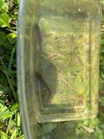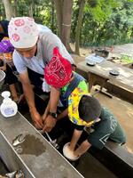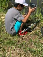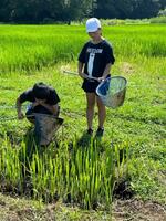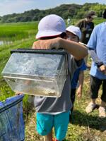 稲の生長を観察した後は、田んぼの生き物調査です。網を使って、水田や水路にいる水の中の生き物を採取して観察しました。ヤゴ・ガムシ等の水生昆虫、カダヤシ・モツゴ・銀ブナ・ドジョウなどの魚類、ヌマガエル・アマガエルなどの両生類とそのオタマジャクシ、アメリカザリガニ・スジエビなどの甲殻類と、たくさんの水棲生物を採取し観察することができました。(吉岡先生大活躍!!)
