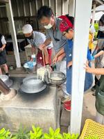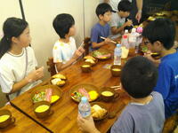 練習は家庭科室で行い、ご飯は給食のご飯を利用したので飯盒による炊飯は初めての体験です。(次年度は事前にかまどを設定しての事前練習を行います!!)野菜を切り、米を研ぎ、水の分量等を量って下準備をした後に飯盒と鍋をかまどに設置し、薪を使っての調理を楽しみました。初めはおっかなびっくりの様子でしたが、徐々に慣れて最後には笑顔あふれる調理体験となりました。応援に来てくださった木下先生を交えて、みんなで美味しくいただきました。