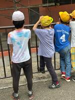 体育ではなく、生活科の学習の一環となるのでしょうか。空き容器を使った手作り水鉄砲を使って楽しそうに遊んでいました。水着ではなく、普段着だからこそ上がるテンションもあるようです(笑)