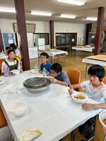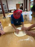 2日目のメインの活動は「手作りうどん体験」です。うどんを打つ経験はおろか、うどんが何から作られているかも知らない状況でしたが、あすなろの里の担当職員さんの丁寧なご指導の下、協力して楽しく、美味しいうどんを打つことができました。