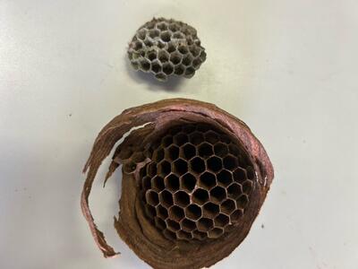 スズメバチの後に除去したアシナガバチの巣と比べると一室一室の大きさの違いがよくわかります。子どもたちの安全のために、自身の楽しみのために、学校敷地内及び敷地周辺にハチの巣ができた時には迅速・確実に撤去いたします。