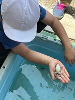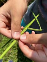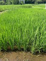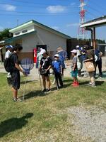 高気温で強い日差しの中、共生ファームさんにお邪魔し、稲の観察と田んぼの生き物調査をしに行きました。4月に田植えをした稲が、すっかり大きくなり稲穂を出す準備をしていたり、稲穂が開き稲の花が咲いたりしていました。みんなで植えた時には、1か所につき3本~5本くらいをまとめて植えましたが、分けつを繰り返し、30本以上程にも増えていました。スカスカだった田んぼも稲でいっぱいになっていました。6月の豪雨で一度水を被ってしまいましたが、今年は日照時間が長く順調な生育とのことです。9月5日(予定)の稲刈りが楽しみです