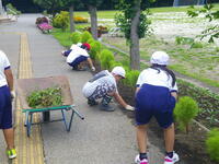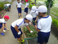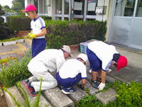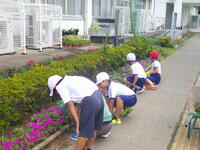 毎月第2の木曜日は、自治会の資源回収とグリーンボランティアの活動があります。資源回収は、今日もたくさんの方々にお持ちよりいただき、資源を回収することができました。本日のグリーンボランティアの活動は、敷地内外及び花壇の除草作業を行いました。「グリーンボランティアに参加して下さっている地域の方々を知りたい、協力して一緒に活動をしたい」という願いを持って、今日は3年生の皆さんが一緒に花壇の除草作業を手伝ってくれました。