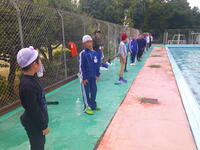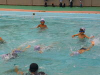 準備運動・水慣れの後、先日着衣水泳を実施した5・6年生の皆さんの手を借りて、全員で「命を守るために浮いて待つ」練習を行いました。その後、授業で入る時よりもずっと長い自由時間を満喫しました。子どもたちの嬉しそうな笑顔が見られることは、うれしいことです。