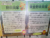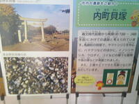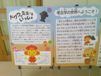 けやきルーム前・横の廊下に、野田市郷土博物館からお借りした野田市の史跡(貝塚)のパネルが飾られています。貝塚は、狩猟や採集の暮らしをしていた昔の人たちのゴミ捨て場跡です。たくさんの貝の他、イノシシやシカなどのけものの骨、サメの歯なども見つかっています。今から2000~7000年以上前に住んでいた人たちが、どのようなものを食べていてどのような暮らしをしているかを予想することができます。また、住居跡からは住んでいた人の骨も見つかっているそうです。