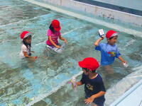 着衣泳が終わった後、プール水の入れ替えのため水深を下げました。そこをねらって、1年生が着衣のまま水遊びに来ました。(実施は連絡済みで、ちゃんと着替えも持ってきています)