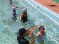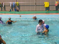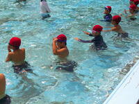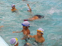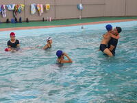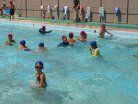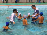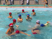 準備運動・水慣れの後、先日着衣水泳を実施した5・6年生の皆さんの手を借りて、全員で「命を守るために浮いて待つ」練習を行いました。その後、授業で入る時よりもずっと長い自由時間を満喫しました。子どもたちの嬉しそうな笑顔が見られることは、うれしいことです。