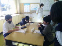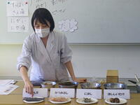 「うま味」から、出汁の話を引き出し、子どもたちからは知っている出汁の種類が発表されました。その後、実際に「鰹節・昆布・煮干し・干し椎茸」から取った出汁を味見して充てたり、合わせ出汁を飲んでうま味の相乗効果があることを体験したり、「合わせ出汁入り」と「味噌のみ」のみそ汁をのみ比べたりしました。子どもたちにも、その違いははっきりと感じ取れたようでした。とても良い体験ができました。授業の後に給食で出された「だし香る白菜のすまし汁」の味も一際おいしかったことでしょう。とても良い体験をすることができました。