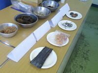 「うま味」から、出汁の話を引き出し、子どもたちからは知っている出汁の種類が発表されました。その後、実際に「鰹節・昆布・煮干し・干し椎茸」から取った出汁を味見して充てたり、合わせ出汁を飲んでうま味の相乗効果があることを体験したり、「合わせ出汁入り」と「味噌のみ」のみそ汁をのみ比べたりしました。子どもたちにも、その違いははっきりと感じ取れたようでした。とても良い体験ができました。授業の後に給食で出された「だし香る白菜のすまし汁」の味も一際おいしかったことでしょう。とても良い体験をすることができました。