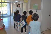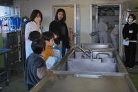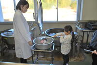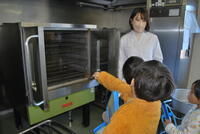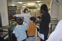 初めて間近に見る、大きななべやオーブン、コンロ、給食を2階・3階まで運ぶリフトなど、どれも新鮮に目に映り、興味津々です。大きなおたまやしゃもじなどを実際に持ってなべをかき混ぜる疑似体験を行うこともできました。