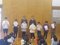 令和5年度の修了式を実施しました。代表児童に「修了証(兼)後期あゆみ」を授与し、校長の話、青木先生から春休みの生活についての話をしました。