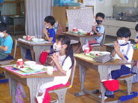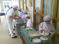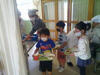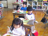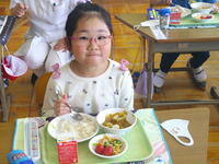 1年生が、小学校で初めて給食を食べました。4時間目に栄養士の若松先生を講師に「給食と仲良くなろう」のめあてで、身支度や準備の仕方、食前・食中・食後の注意などについて学習しました。早速、給食当番の仕事も始まりましたが、共同配膳の2年生にリードされて、上手に登板の活動をこなしていました。登板さんの分の給食も、お友達が準備してくれました。記念すべき初メニュー(メイン)は、みんな大好き「福二カレー」でした。