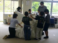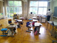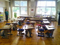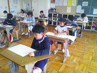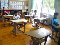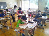 5・6年生は、法律上2学年で1学級の扱いとなる「複式学級」となっています。教科の学習は「小規模特認校講師」を始めとした職員の協力して指導に当たり、学年別に実施していますが、技能教科については基本5・6年合同で実施していました。しかし、技能教科であっても学年ごとの内容や学習のねらいが違う部分もあります。今日は、5年生は教室で担任による家庭科(家庭科の学習で学ぶこと、家で行われる仕事について)の学習を、6年生は専科講師による音楽(おぼろ月夜の歌唱等)に取り組んでいました。