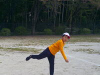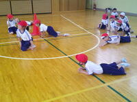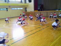 連続立ち幅跳び、カニ歩き(深い伸脚のくり返し)、長座(足を伸ばした状態で座る)から手を使わずに立ってダッシュ、仰向けの状態から起き上がってダッシュ、大股走などバラエティに富んだメニューをこなしていました。児童はうっすらと汗をかき、息を弾ませていましたが、とても楽しそうに取り組んでいるのが印象的でした。