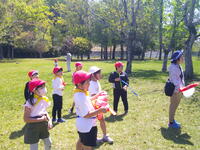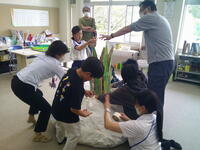 建物のすぐ前にある営巣塔には、ヤマトくん?が巣作りの真っ最中で、高いところで子どもたちを出迎えてくれました。靴を消毒した後で’(鳥インフルエンザ対策)建物の中に入り、コウくん、コウちゃんの夫婦コウノトリを観察しながら施設の方のお話を聴きました。コウくんは、何度も飛んで旋回を見せてくれたり、クラッタリング(くちばしを打ち合わせて音を出すこと)を聞かせてくれたりと、大サービスでした。コウノトリの帽子を被ったり、施設の方に積極的にし質問したりする姿が見られ、ここ何年かの中で一番ノリノリの施設見学となりました。