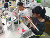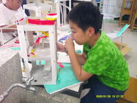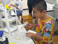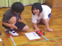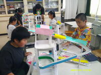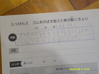 3年生が理科で「ゴムと風の力のはたらき」の学習に取り組んでいました。今日は、けやきルームを使って「ゴムの伸ばし方を変えたときの車の進む距離を比べながら調べる」実験に取り組んでいました。ゴムの力のはたらきの強さ(=ゴムの伸ばし方)を変えると、車の進み方が変わることを理解し、しっかりと記録することができたでしょうか。