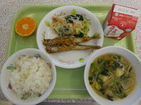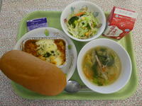 ポテトミートグラタンには、じゃが芋をはじめ人参、玉ねぎ、大豆をたっぷり入れて作りました。ブロッコリーのサラダや白菜とベーコンのスープには、野菜をたくさん使っています。じゃが芋と玉ねぎは隣の畑産、小松菜は東部地区産、人参は千葉県産です。今日も残菜はほとんどありませんでした。