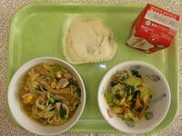 コーンラーメンには、味付けメンマ、もやし、ねぎ、なるとまきなどたくさんの具材を入れました。コーンを最後に入れ、シャキシャキ感を出しました。手作り肉まんには、ひき肉とたけのこ、しいたけ、玉ねぎなどの具材とニンニク、ショウガを入れ、給食室で一つ一つ手作りしました。ほうれん草、玉ねぎは隣の畑産、小松菜は東部地区産、人参、ネギは千葉産です。